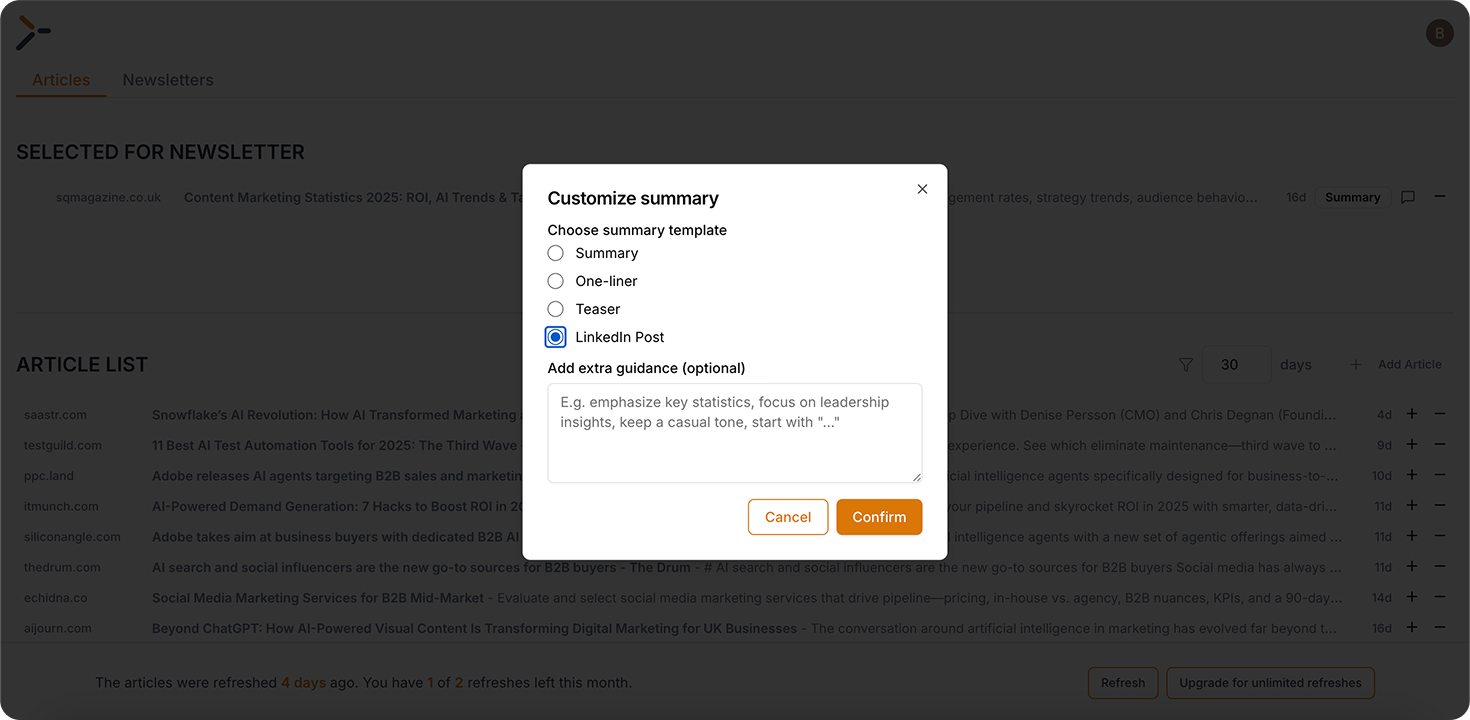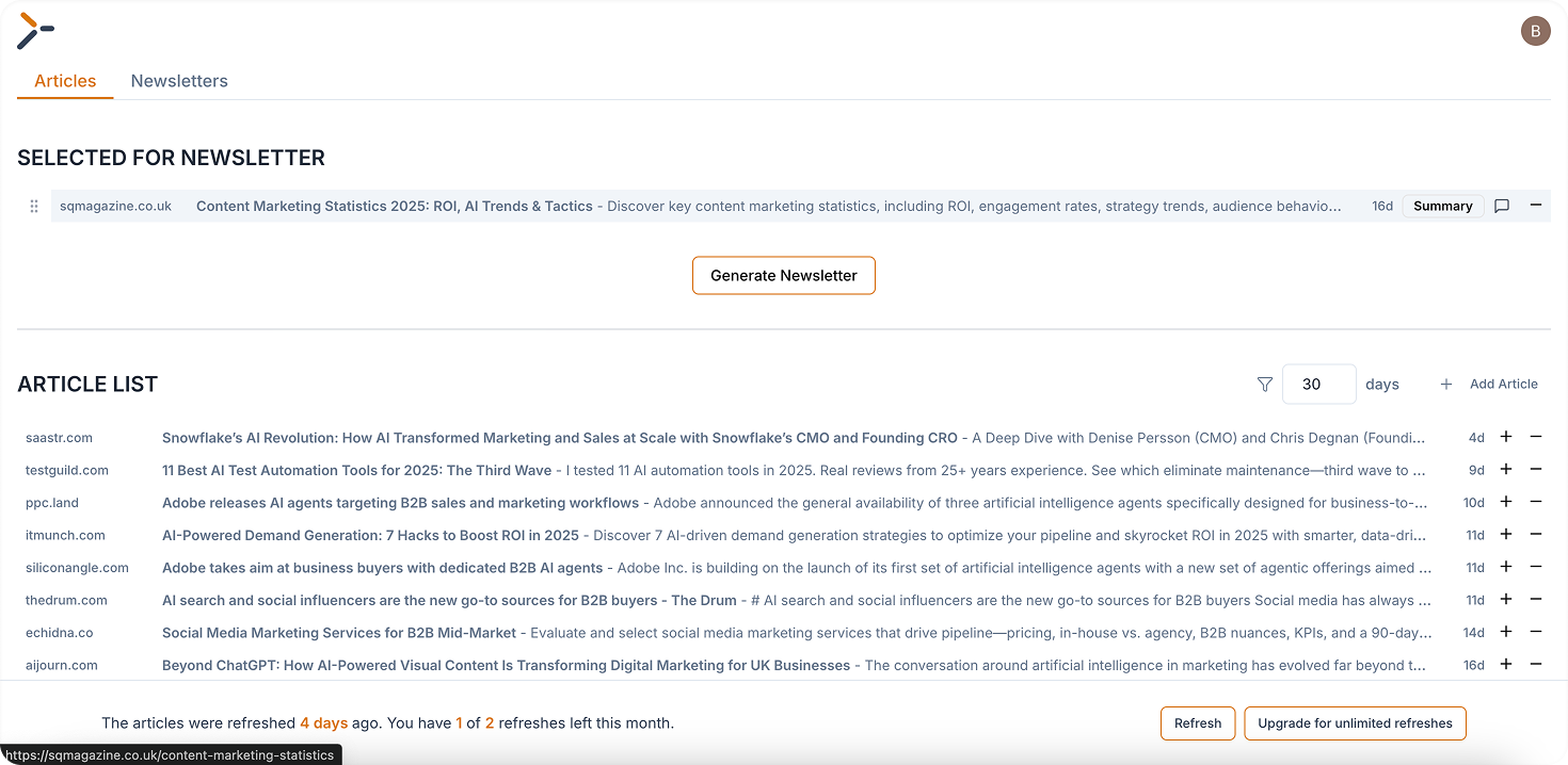 Result: Your Articles feed auto-refreshes with credible, on-topic sources—no manual hunting.