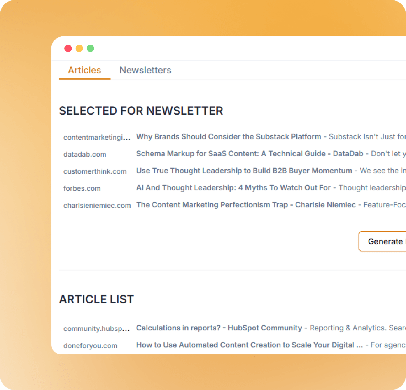 Most “AI newsletter generators” guess from a prompt. ZestScout starts from credible sources matched to your audience, then turns each link into tight, skimmable sections you can paste into your ESP (Substack, Mailchimp, HubSpot, Beehiiv, ConvertKit).